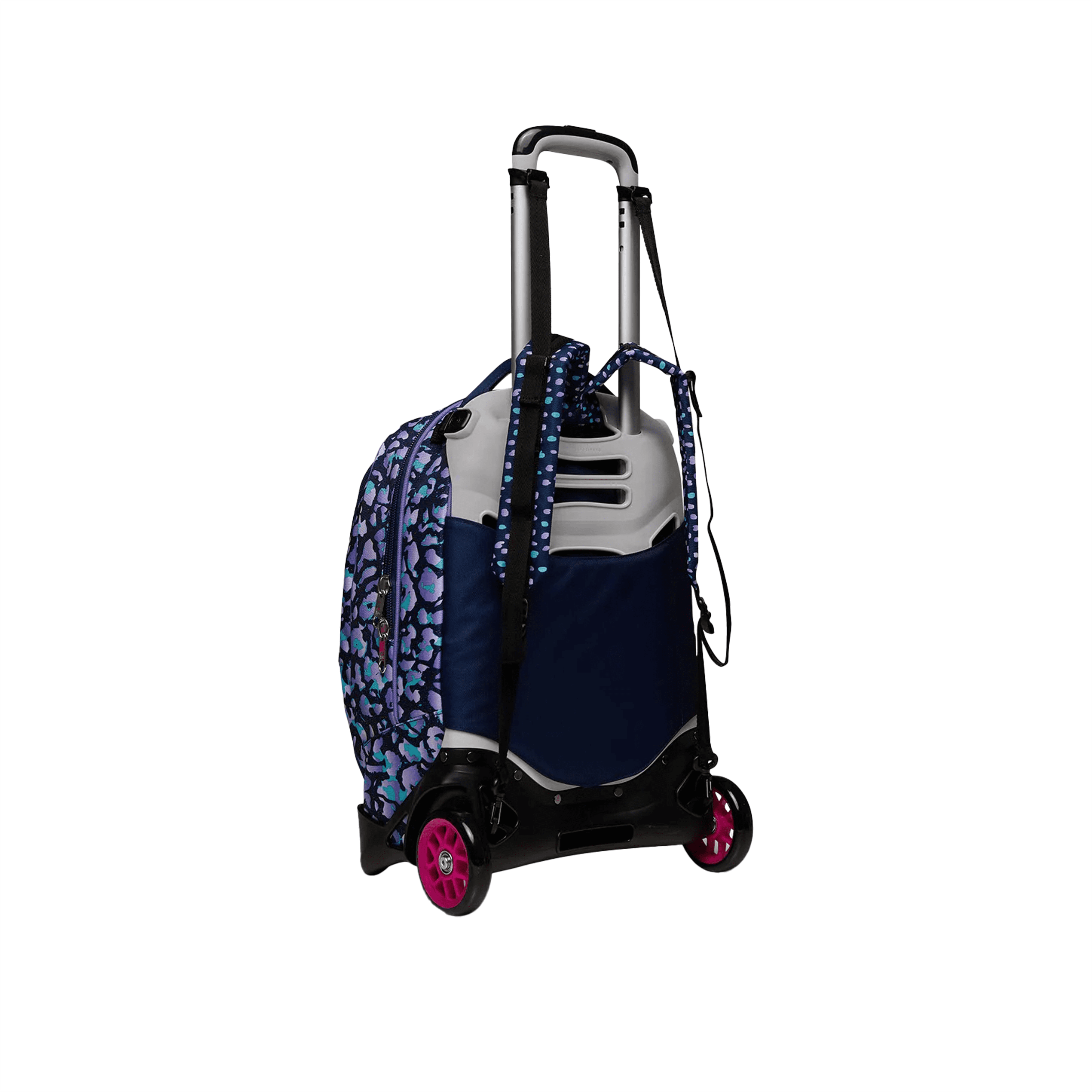 المميزات : الجِيب يمكن استخدامه بطريقتين (يمكن تحوله إلى شنطة ظهر أو تستخدمها مع العجلات)، والجيب الداخلي الواسع مال الشنطة هو... مصمم ليستوعب أنواع مختلفة من الأشياء، مثل الكتب والدفاتر.، واللي تگدر تخزنها بسهولة بالجيب الخاص بيه.