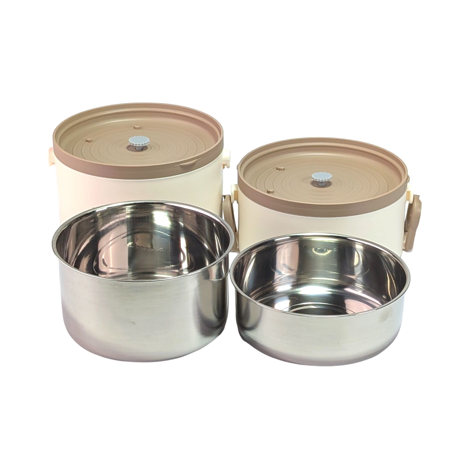 Enjoy fresh meals on the go with this practical 2-layer bento box. It has a durable stainless steel interior with a plastic exterior and easy-grip plastic handle for comfortable carrying.